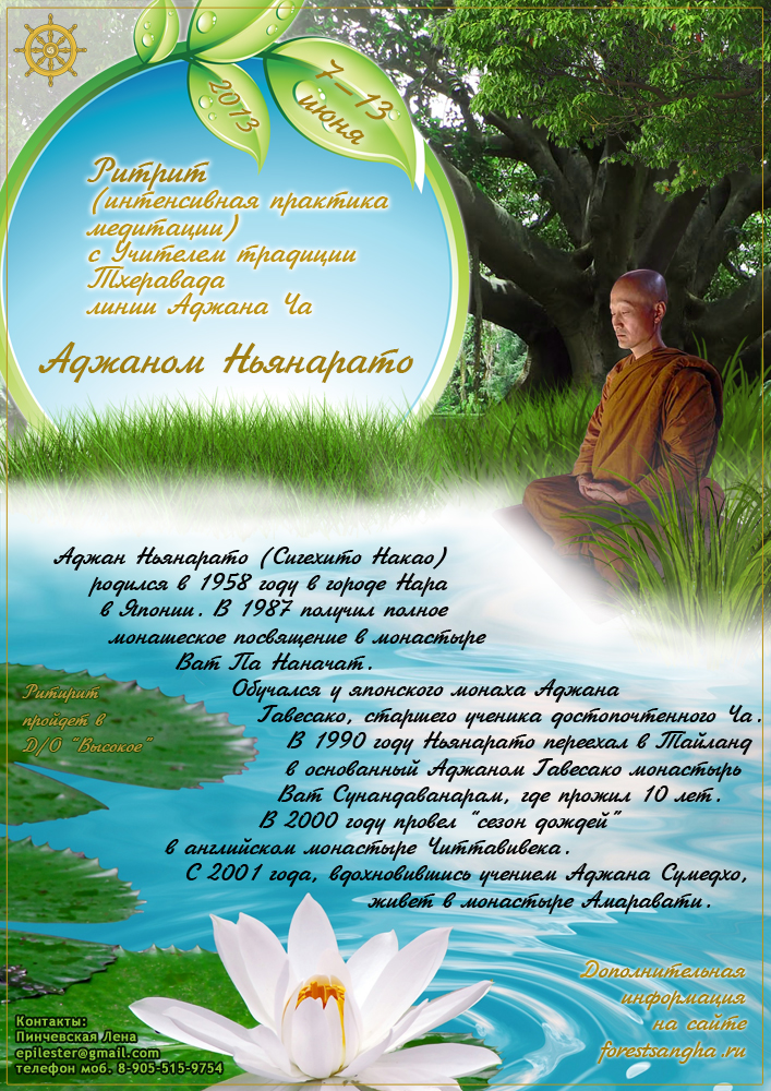 Ритрит с Аджаном Ньянарато в Подмосковье с 7 по 13 июня 2013 года Приглашем всех на интенсивную практику медитации (випассана) с Аджаном Ньянарато в традиции тайской тхеравады лесной школы линии Аджана Чаа.Ритрит планируется провести в д/о “ВЫСОКОЕ”. Общая стоимость проживания на время ритрита в двухместных номерах со всеми удобствами, включая питание в д/о «Высокое» и организационные расходы: 7600 р. Пожалуйста, для того чтобы как можно лучше спланировать организацию ритрита, предварительно зарегистрируйтесь на участие до 20 мая 2013 года. Если есть вопросы, пишите, звоните Лена +7-905-515-97-54 epilester@gmail.com Максим +7-905-709-31-92 buddham@mail.ru вы можете найти нас на Facebook http://www.facebook.com/groups/288948477814732/ |